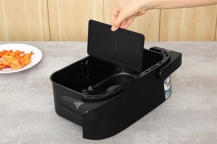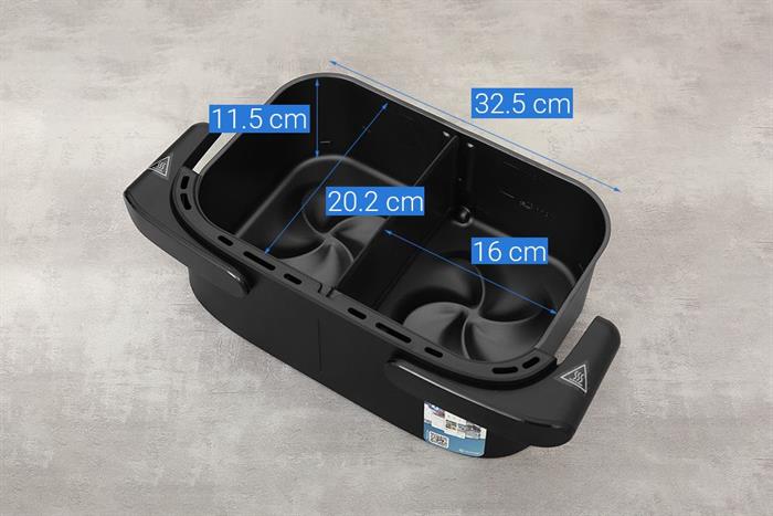 Bạn có thể dùng một ngăn khi chỉ cần nấu khẩu phần nhỏ, hoặc tận dụng cả hai ngăn để chế biến hai món khác nhau cùng lúc, vừa tiết kiệm thời gian, vừa không lo món này ám mùi món kia. Khi tháo vách ngăn, khay chiên trở nên rộng rãi với dung tích 7.1 lít, đủ sức chiên gà nguyên con 1.5 kg hoặc 9 chiếc cánh gà, phục vụ bữa cơm hằng ngày hoặc những bữa tiệc ấm cúng của gia đình. Thao tác tháo lắp thanh chia ngăn rất đơn giản, thuận tiện vệ sinh sau khi sử dụng.